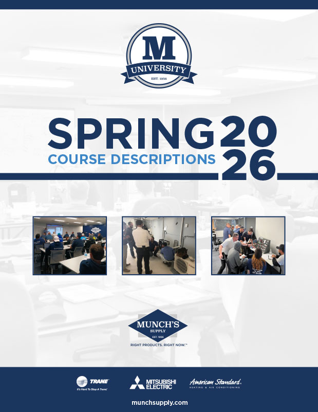 At Munch University, industry experts and in-house trainers offer annual classes that target your company's needs. We offer courses in sales and marketing focused on helping you generate leads, increase closing rates, and up-sell equipment and accessories. We also offer a variety of technical courses with topics on service, installation, application, and trouble-shooting that give your business the proper tools for the HVAC field.